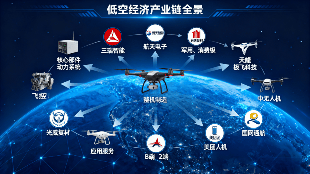 优势:掌握核心技术(如飞控系统、电池技术),提供 “设备 + 基础服务”,主导消费级、工业级无人机市场;中国航空工业在军用、大型无人机领域具备垄断优势。