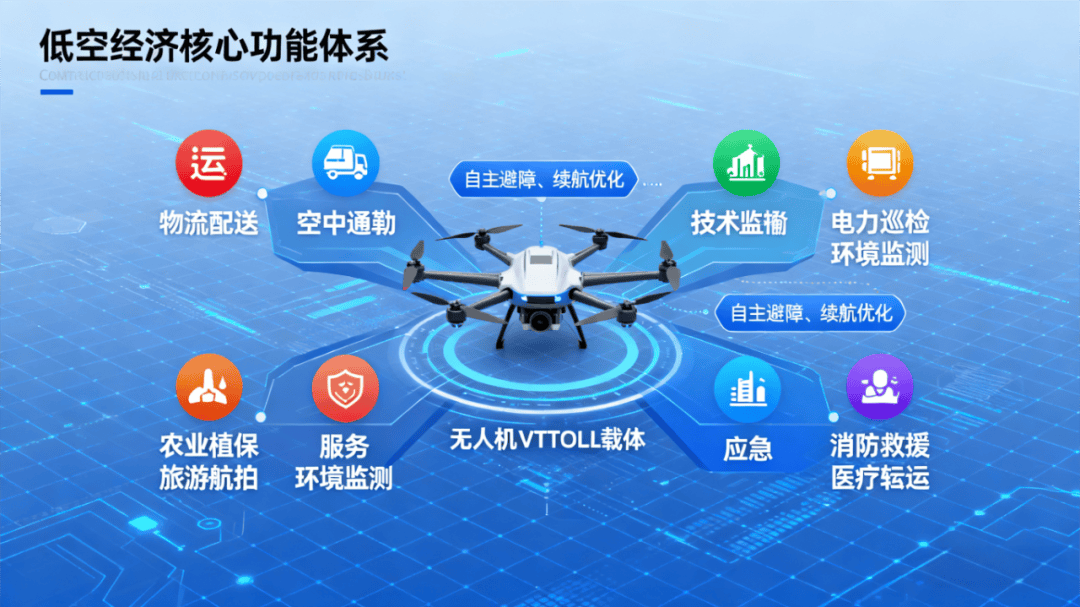 通过低空飞行器替代人工,提升作业效率与安全性。例如,无人机农业植保效率达 300 亩 / 天,是人工的 30 倍,且农药利用率提升 20%;矿区无人机巡检可覆盖人工难以到达的区域,将巡检周期从 7 天缩短至 1 天,安全事故率降低 70%;低空物流配送可避开地面拥堵,“最后 3 公里” 配送时间从 1 小时缩短至 15 分钟。