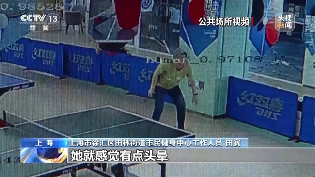 上海市徐汇区田林街道市民健身中心工作人员 田赛:那天打了大概一个半小时的球之后,她在跟别人对打过程中弯腰捡球的一瞬间,她就感觉有点头晕,当时就没有意识了,直接就倒了。